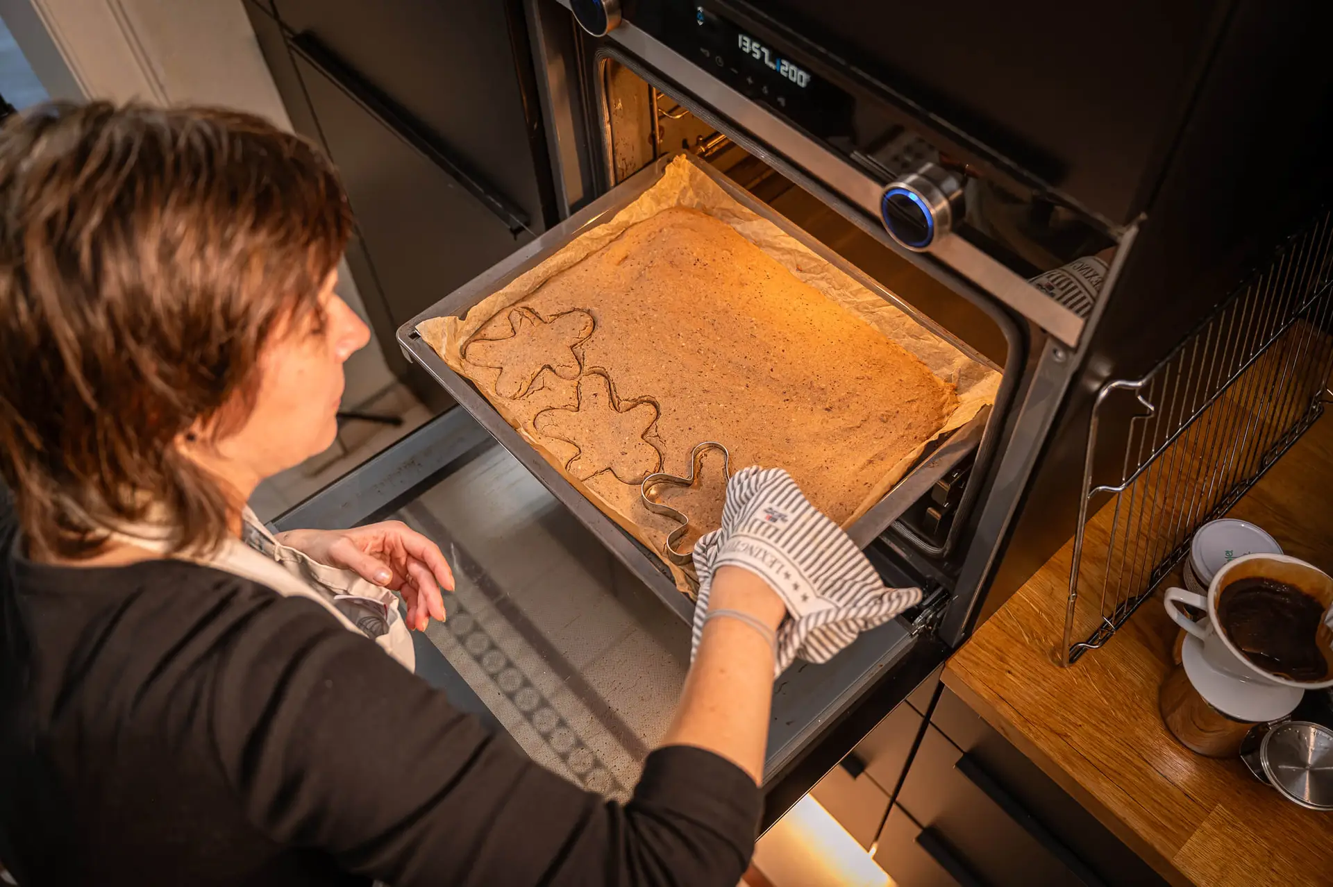 Den Backofen auf 200 Grad (Ober-/Unterhitze) vorheizen und den Teig auf ein mit Backpapier ausgelegtes Backblech streichen. Den Lebkuchenteig ca. 30 Minuten backen. Nach 10 Minuten mit einer Ausstechform die Figuren in den Teig drücken. Vorsicht: Heiß!